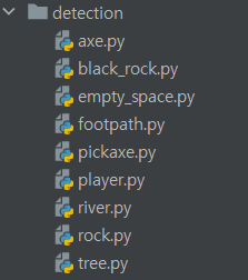 인식해야 할 물체들은 플레이어, 도끼, 곡괭이, 나무, 돌, 검은 돌, 철도, 강 등이 있다.