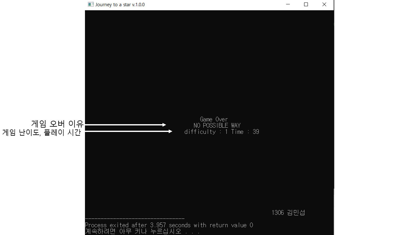 플레이어와 적 사이에 경로가 존재 하지 않는다면 “NO POSSIBLE WAY” 라는 안내와 함께 게임오버되도록 구현했습니다. 이는 astar.c코드안에서 경로를 찾지 못하고 반복문을 빠져 나왔을 경우에 –5를 main.c에 return하여서 main.c안에서 –5가 return되었을 경우 GameOver()함수로 종료시키는 방법으로 구현했습니다.