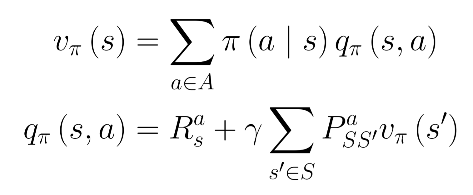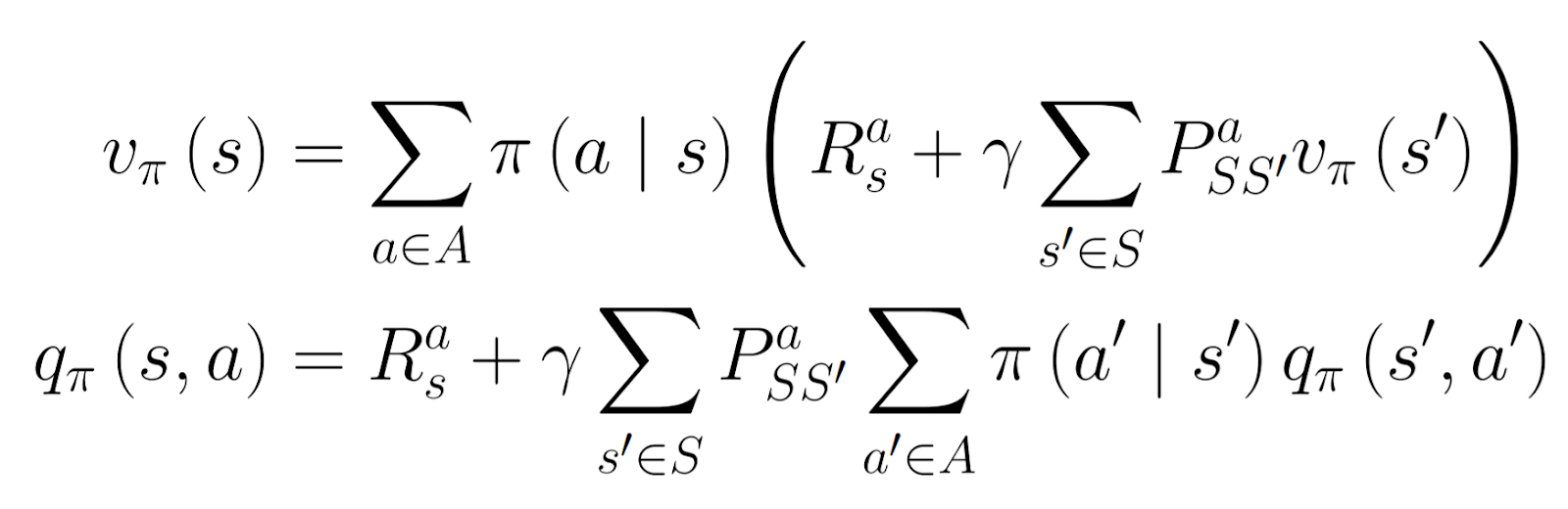 방금 전의 식에 처음의 식을 대입하여 식을 재귀적으로 유도할 수 있습니다. 그리고 이 식을 벨만 기대 방정식이라고 합니다.