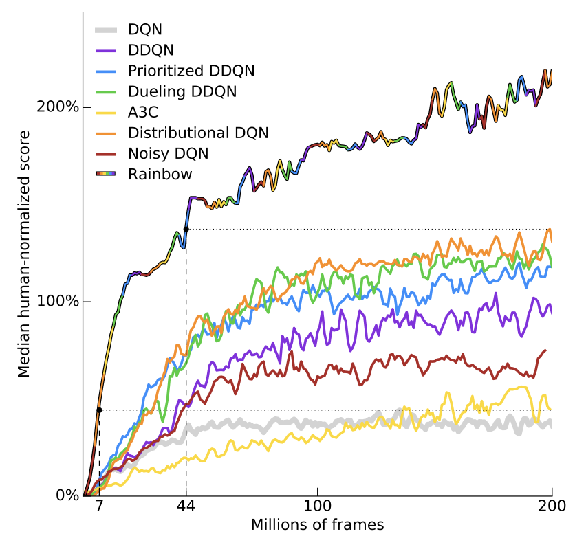아래 그래프에서 보시다시피 Rainbow DQN은 다른 각각의 기법들의 성능을 능가합니다.