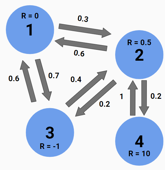 MDP란 아래 그림과 같은 그래프를 의미하고 상태, 행동, 전이 확률, 보상 함수, 감가율을 매개변수로 가집니다. MDP는 순차적 의사결정 문제의 하나로서 마르코프 성질을 가집니다. MDP에서 상태는 에이전트의 위치를 말합니다. 여기서는 1, 2, 3, 4가 상태가 될 수 있습니다. 행동은 에이전트의 움직임을 말합니다. 즉, 하나의 노드에서 다른 노드로 이동하는 것으로 여기서는 총 8가지가 있습니다.